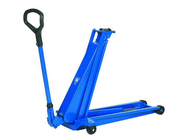 High lifting hydraulic jack ideal for SUV and van applications. Low profile height of 80 mm ideal for cars with low clearance. Wide high-strength steel frame. Precise and safe lowering controls with a built-in safety overload valve. Noiseless wheels incorporating a polyurethane central o-ring for maximum surface protection. Quick lift pedal for easy reach of lifting points.